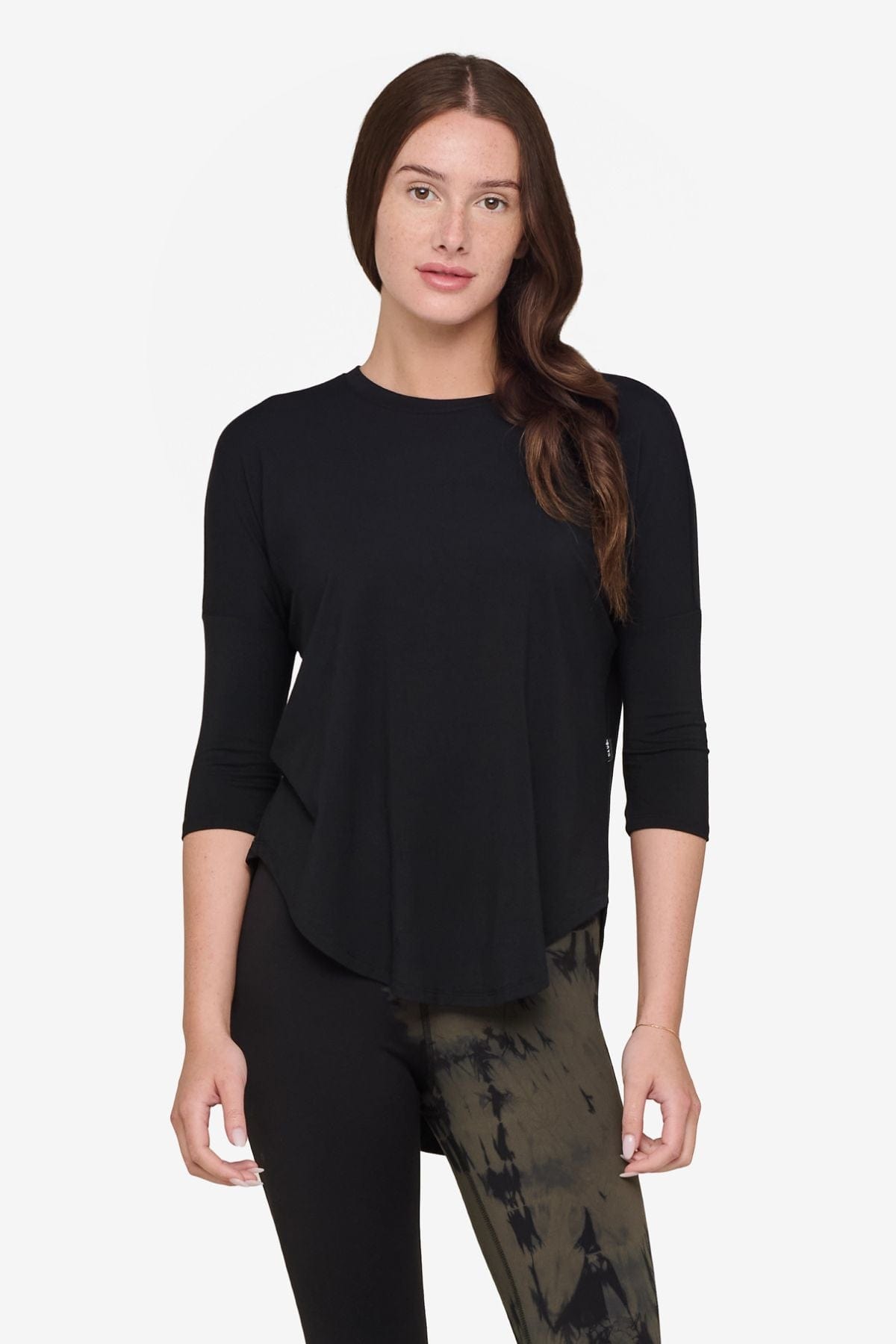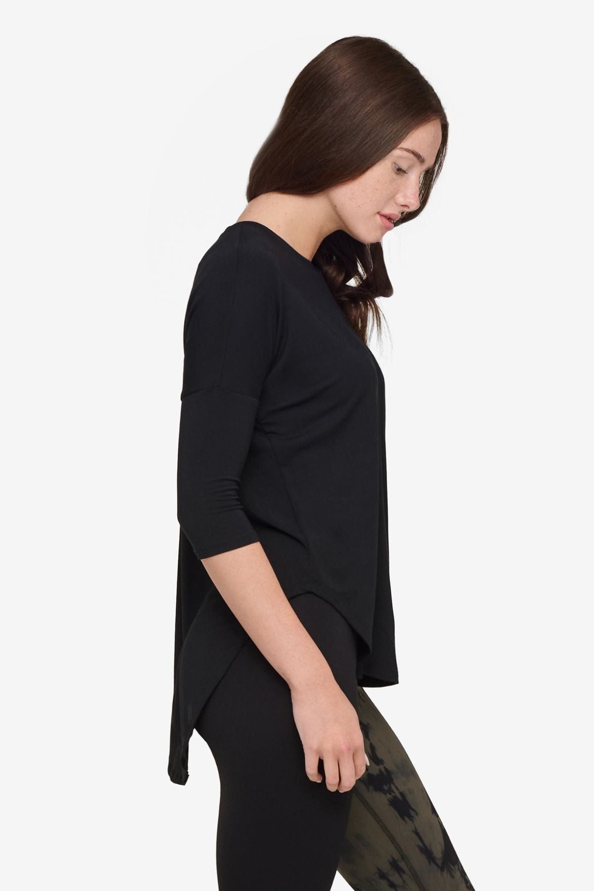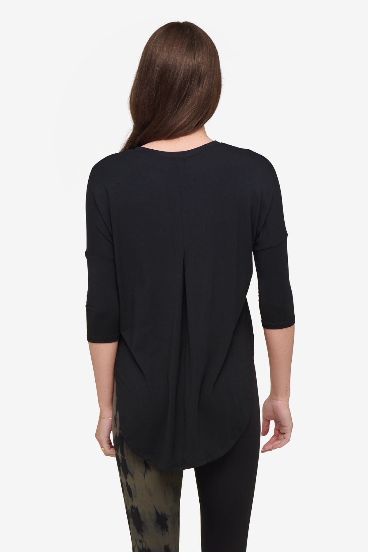 Our Ainsley Tee has a fitted bust and sleeve, as well as a beautiful drape down the waist. The front length sits low on the hip and the back has a longer length to provide more coverage. The pleat at the back gives a flattering volume to the body. The Ainsley Tee is constructed from a modal/spandex blend to keep its shape while keeping it lightweight and flowy.