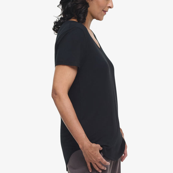 ‘’I like the rounded edge at the bottom that makes the shape more flattering than a straight tee. Fabric is super soft and washes well. Bought another three because I liked it so much!’’ - Ana S