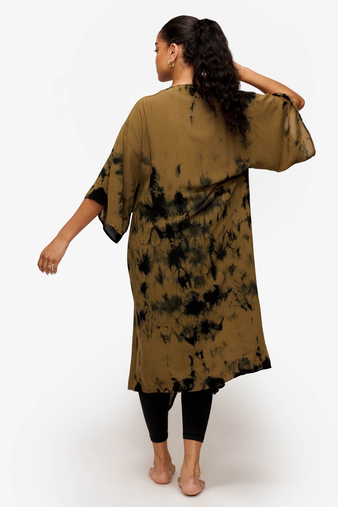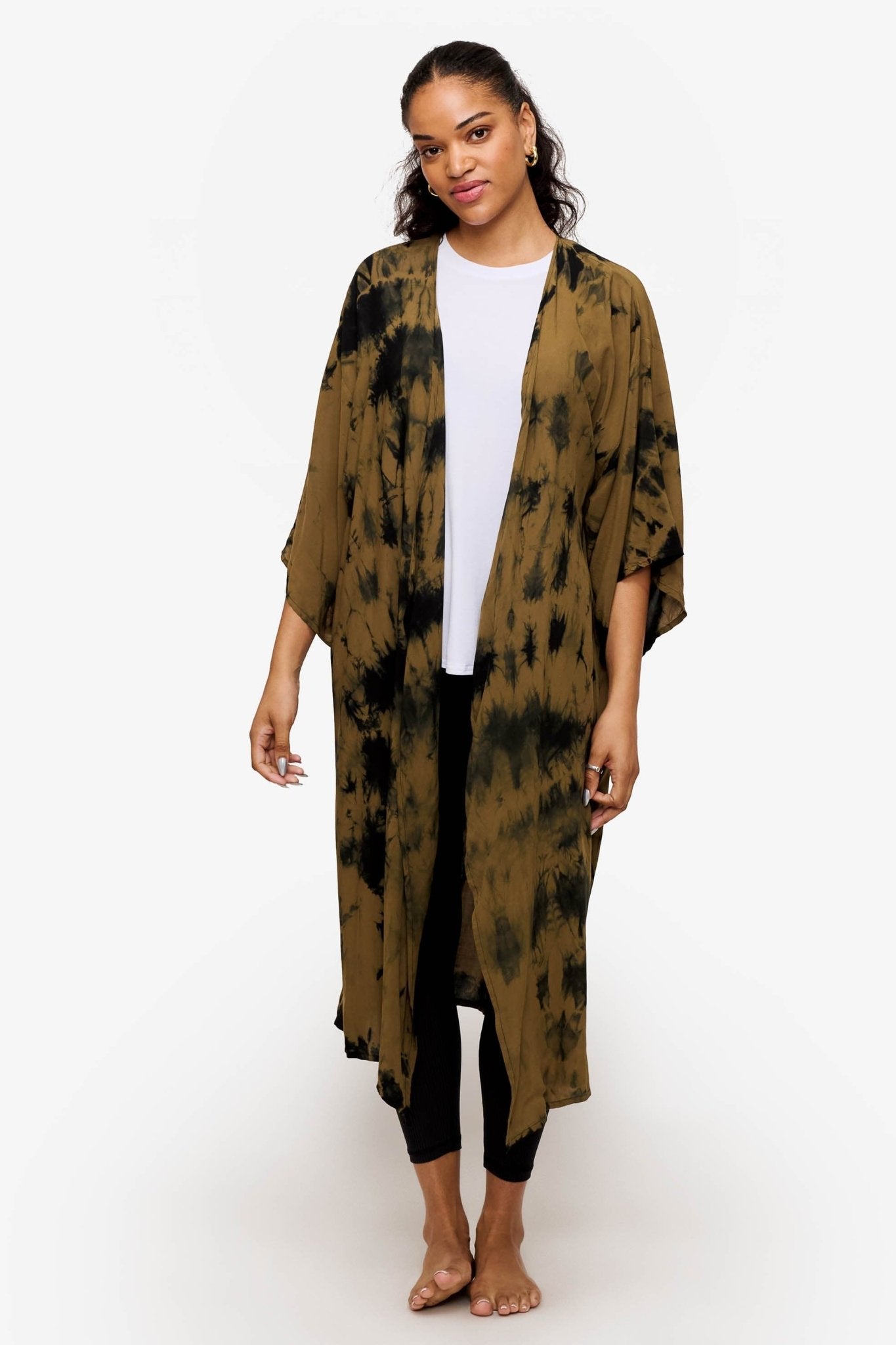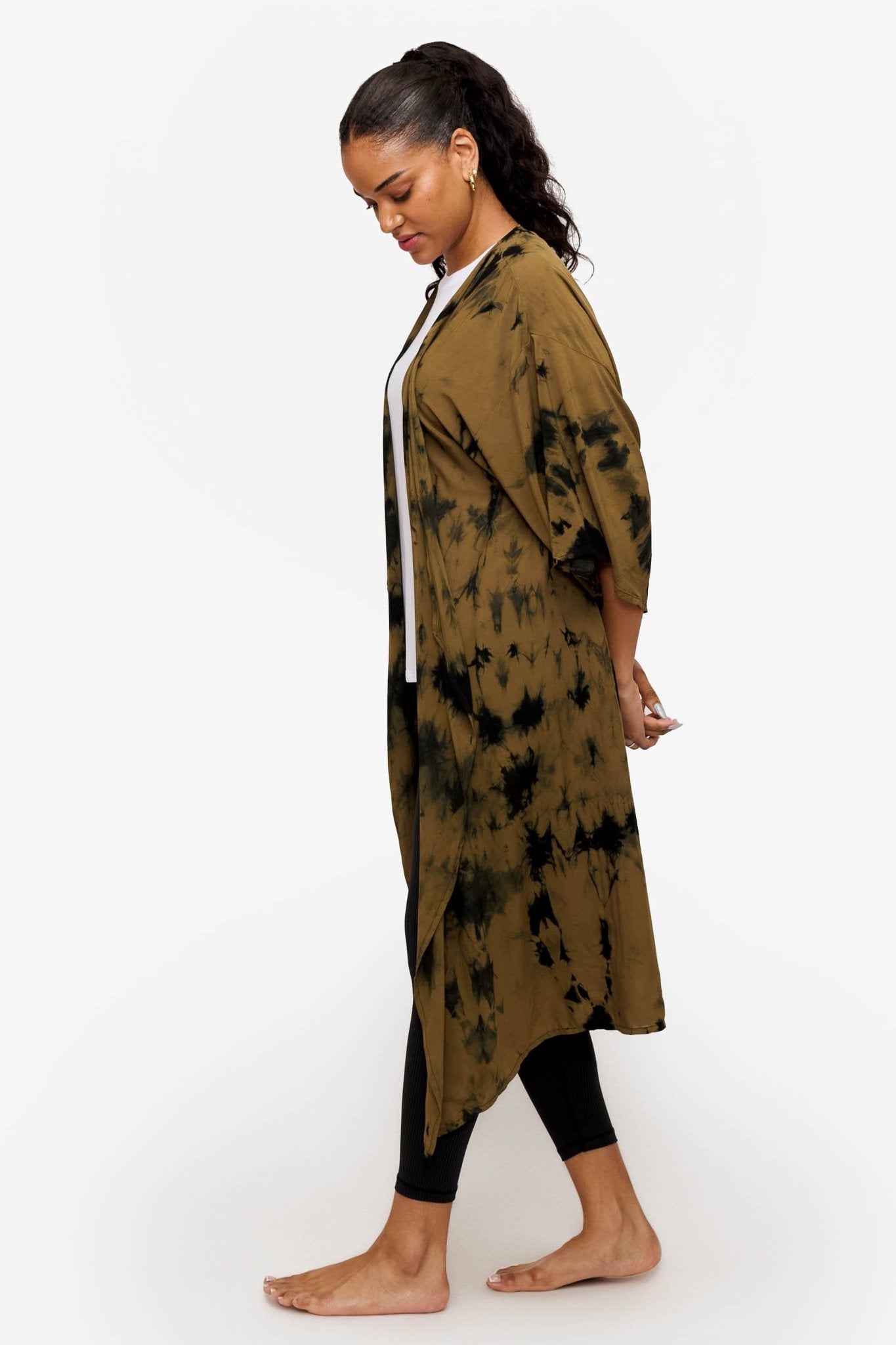 Embrace effortless sophistication with our Duster in Olive, a must-have piece for those who love blending comfort with style. This duster features a hand dye pattern in rich shades of olive green and black, making it a versatile addition to your wardrobe. The open-front design, coupled with loose, flowing sleeves, creates a relaxed fit that drapes elegantly over any outfit.