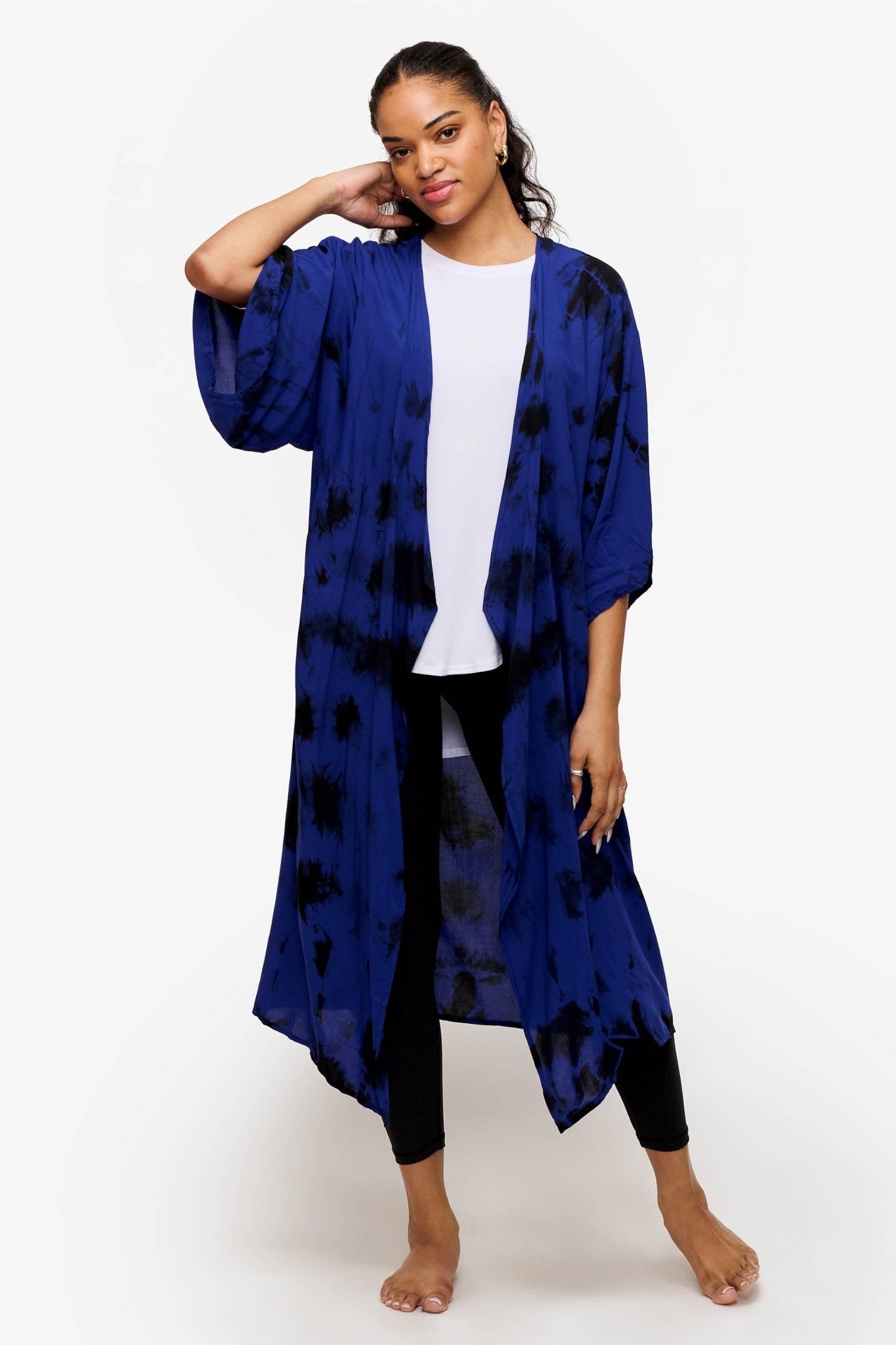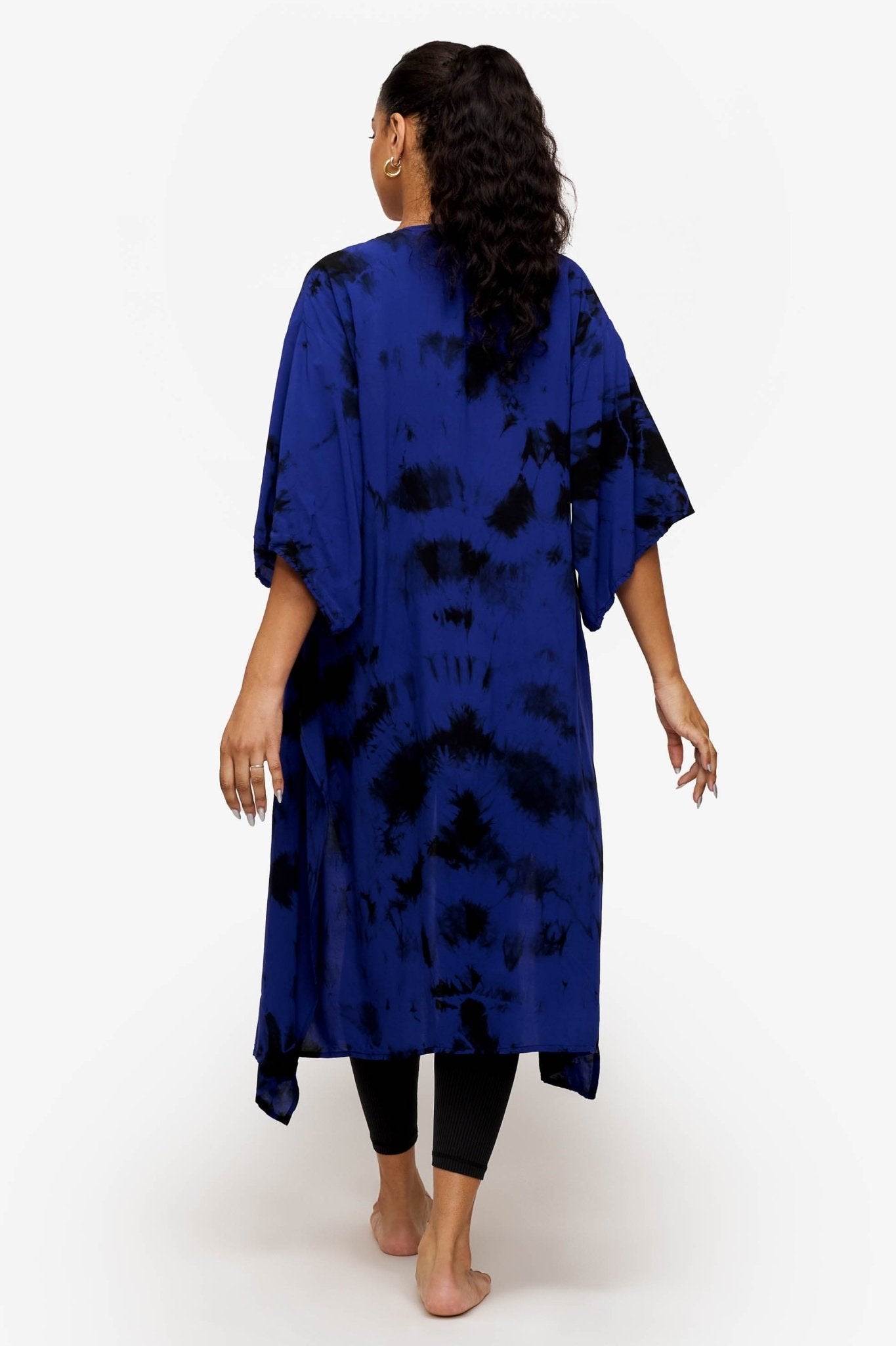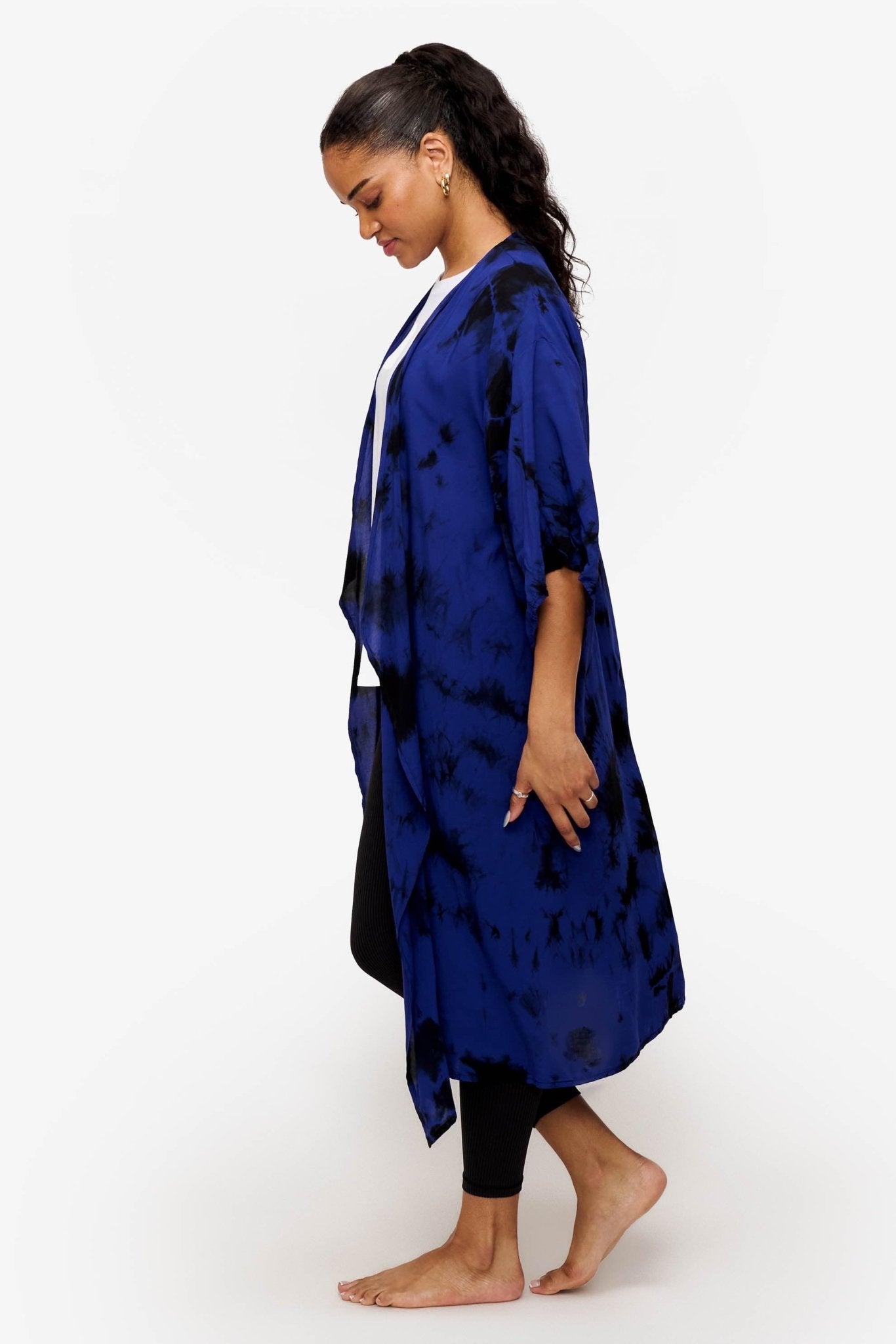 The DAUB Duster in Royal is a statement piece that adds a pop of colour and sophistication to your ensemble. Featuring a deep royal blue backdrop with bold black tie-dye accents, this duster brings a modern twist to classic elegance. The open-front design, complemented by loose, wide sleeves, offers a relaxed fit that flows beautifully with every movement.