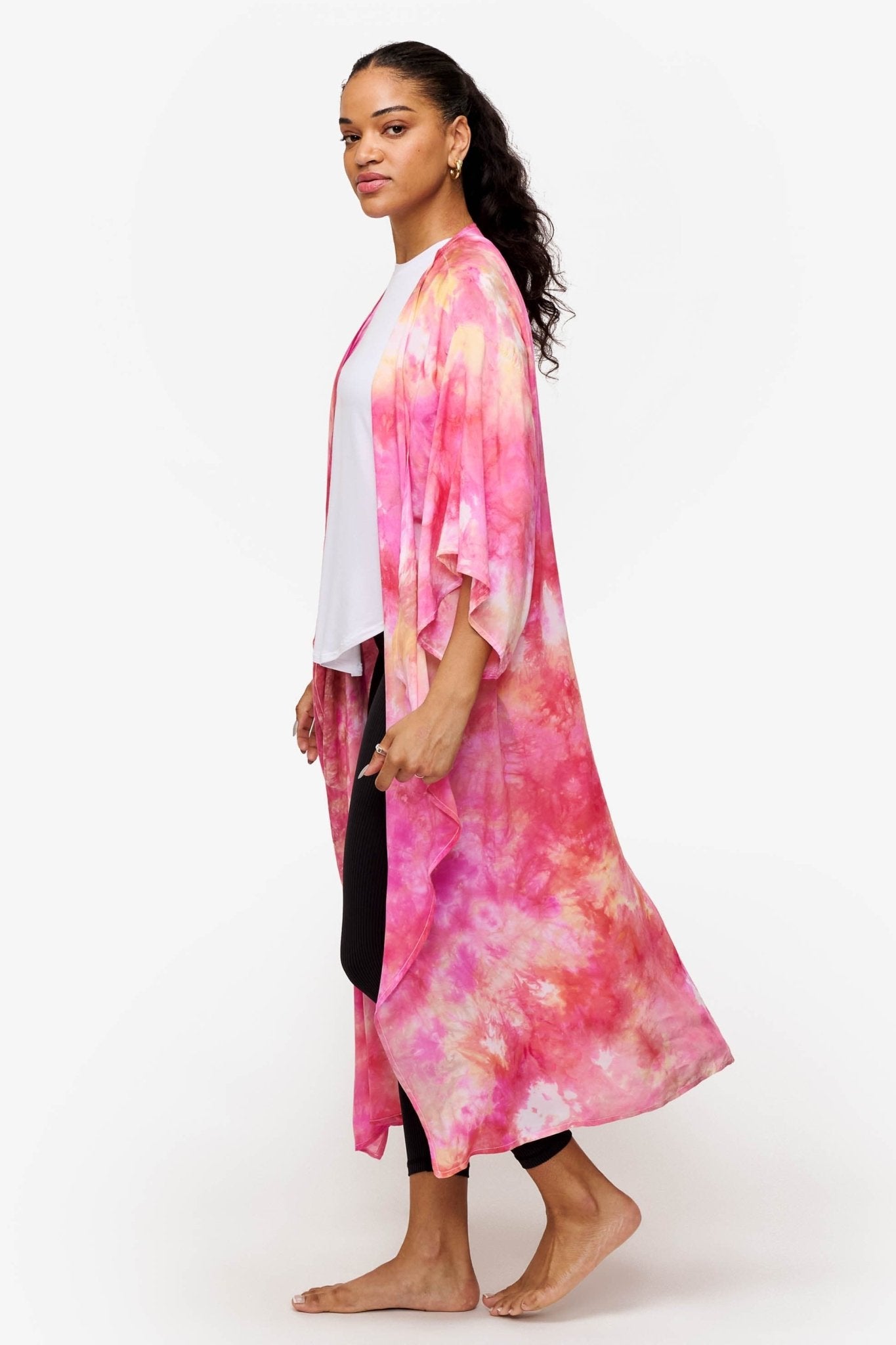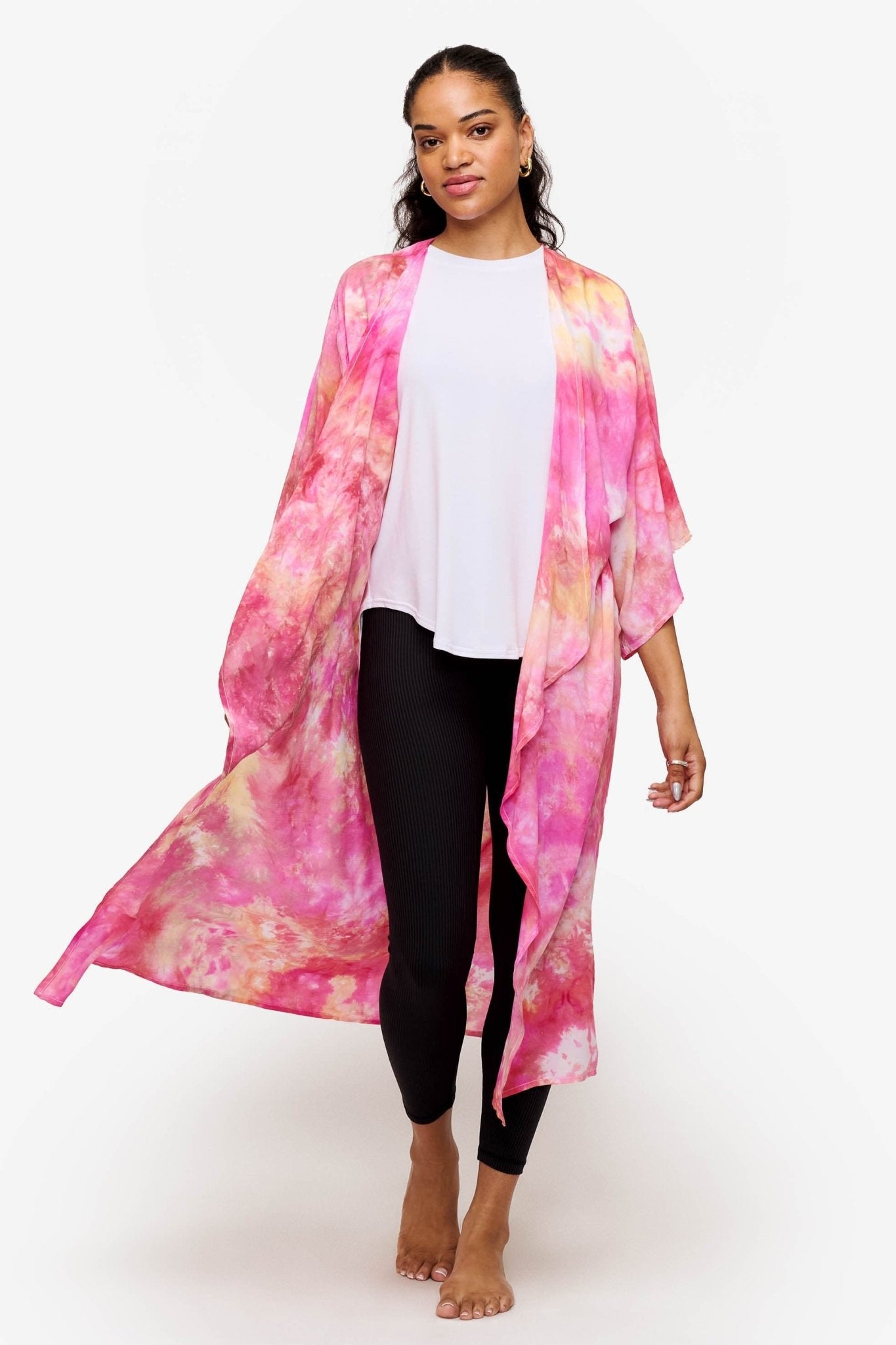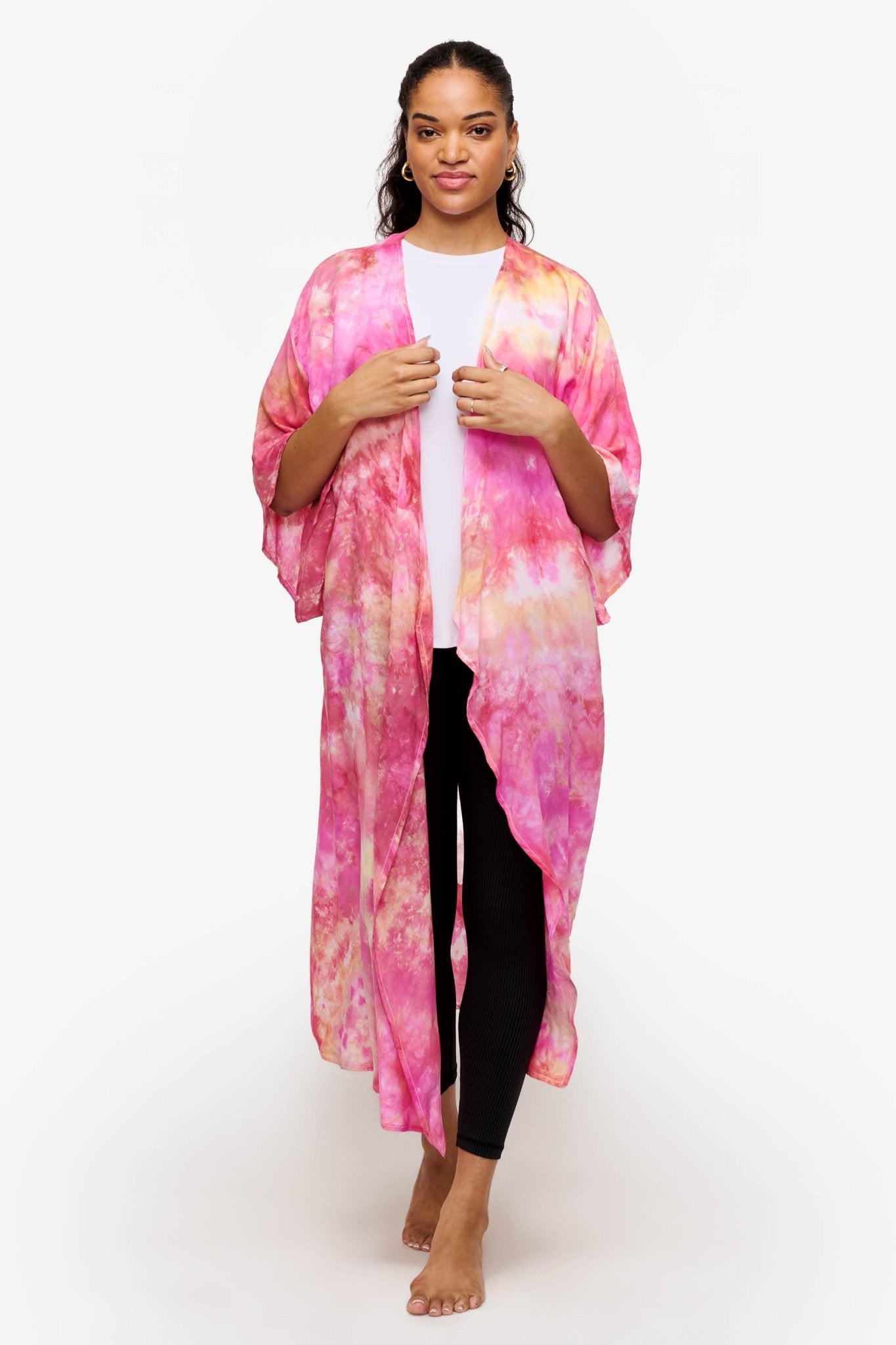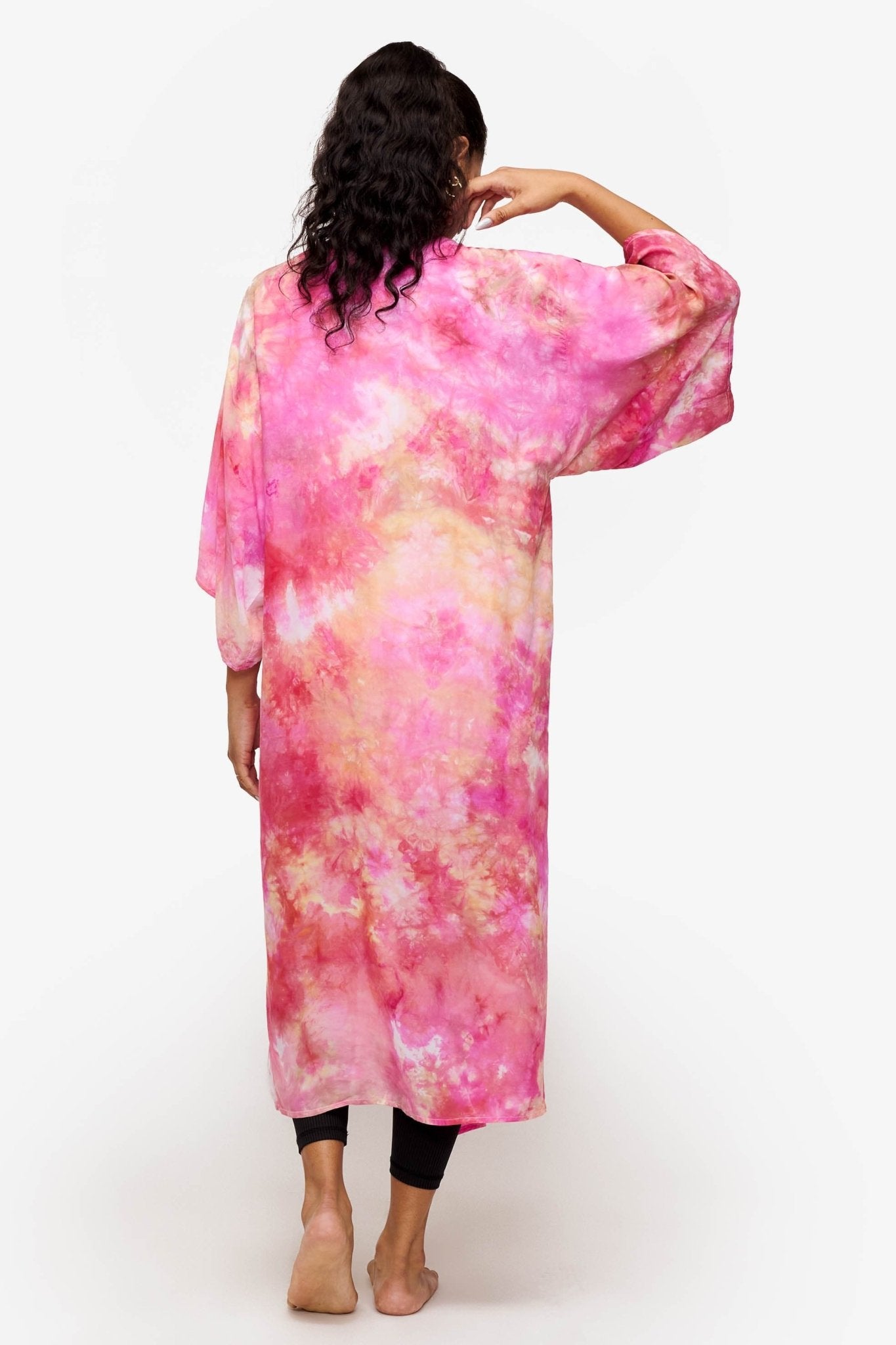 Awaken your style with the DAUB Duster in Sunrise, capturing the vibrant hues of a perfect sunrise. This stunning duster showcases a radiant blend of orange, bright pink, and golden yellow, creating a warm, energizing palette that brightens any ensemble. The unique hand dyed pattern adds a playful touch, making it an ideal statement piece for those who love to express their bold fashion sense.