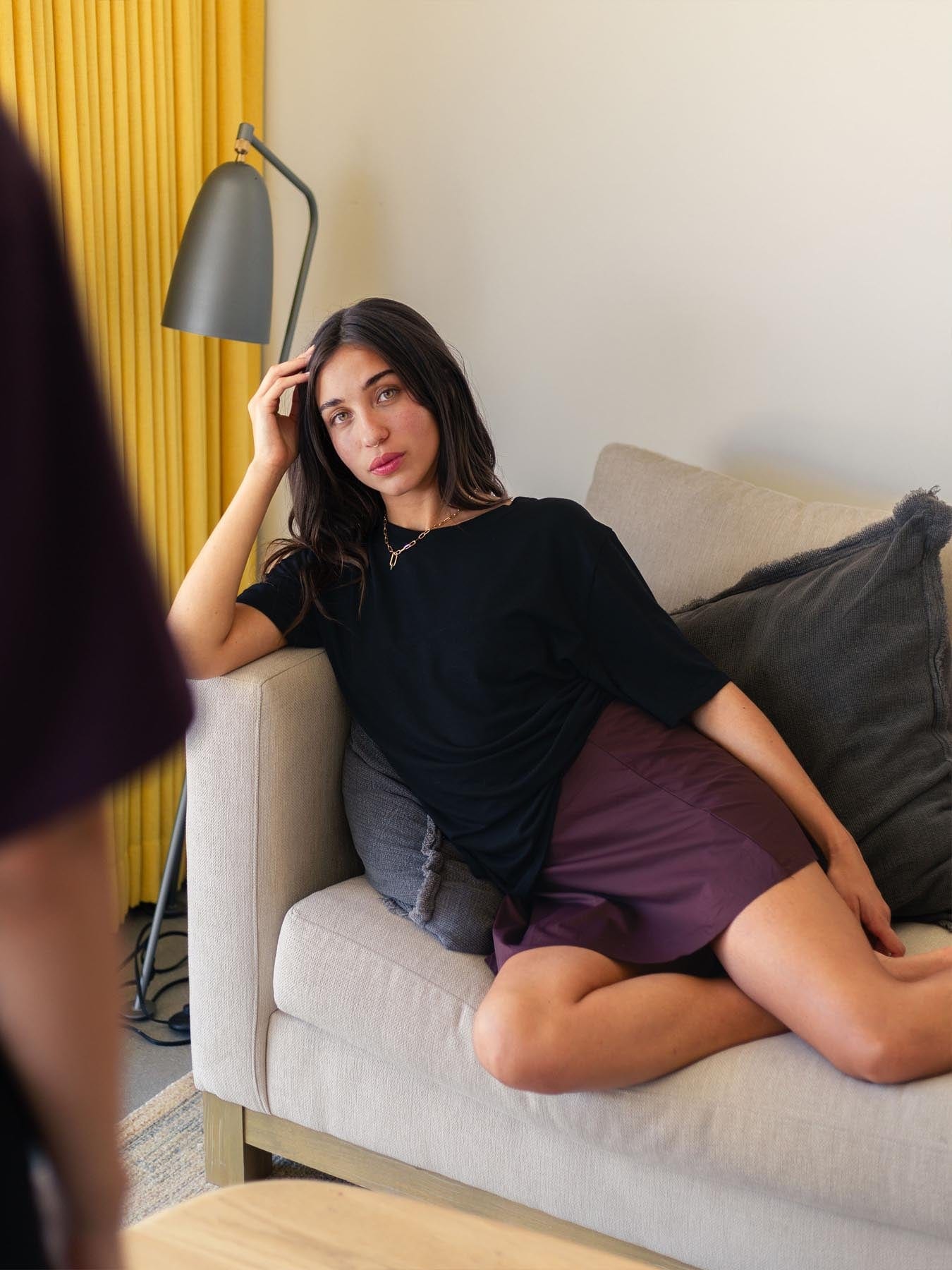 The Weekend Tee is designed to be exactly that: your favourite piece to wear in your off time. Don't let that description fool you though. The Weekend Tee is the perfect tee for every day. Cut from our signature modal fabric, this tee drapes beautifully over the body to hang and give your body shape. The sleeve is longer and looser for coverage and to give a bit of a dressier look.